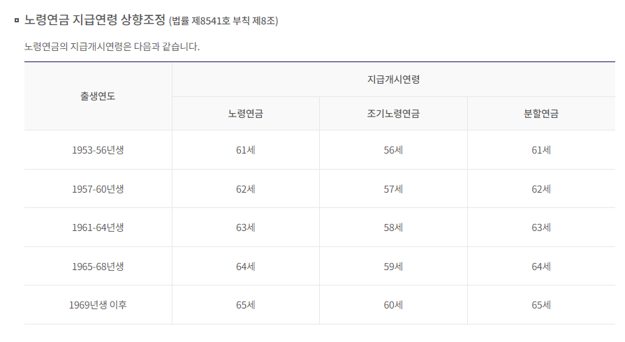 지급개시연령의 경우 61세부터 현재는 65세 이후부터 노령연금이 수령이 가능합니다.