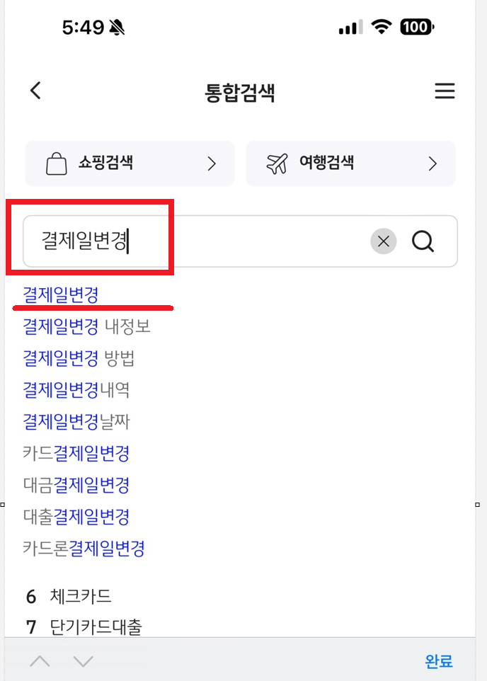검색란에 결제일변경 이라고 입력해 주시고 하단에 검색되는 결제일변경을 클릭해 주세요.