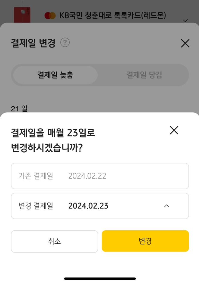 현재의 나의 결제일과 변경을 원하시는 결제일이 나오는데 저는 하루 뒤인 23일을 클릭해 보겠습니다.