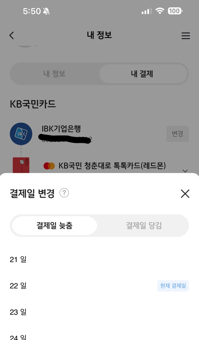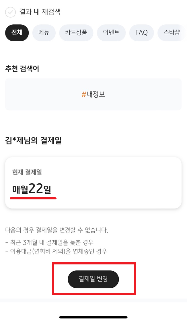눌러주시면 현재 나의 결제일 정보와 변경하고자 하는 결제일을 하단 변경 버튼을 클릭해 주시면 되겠습니다.