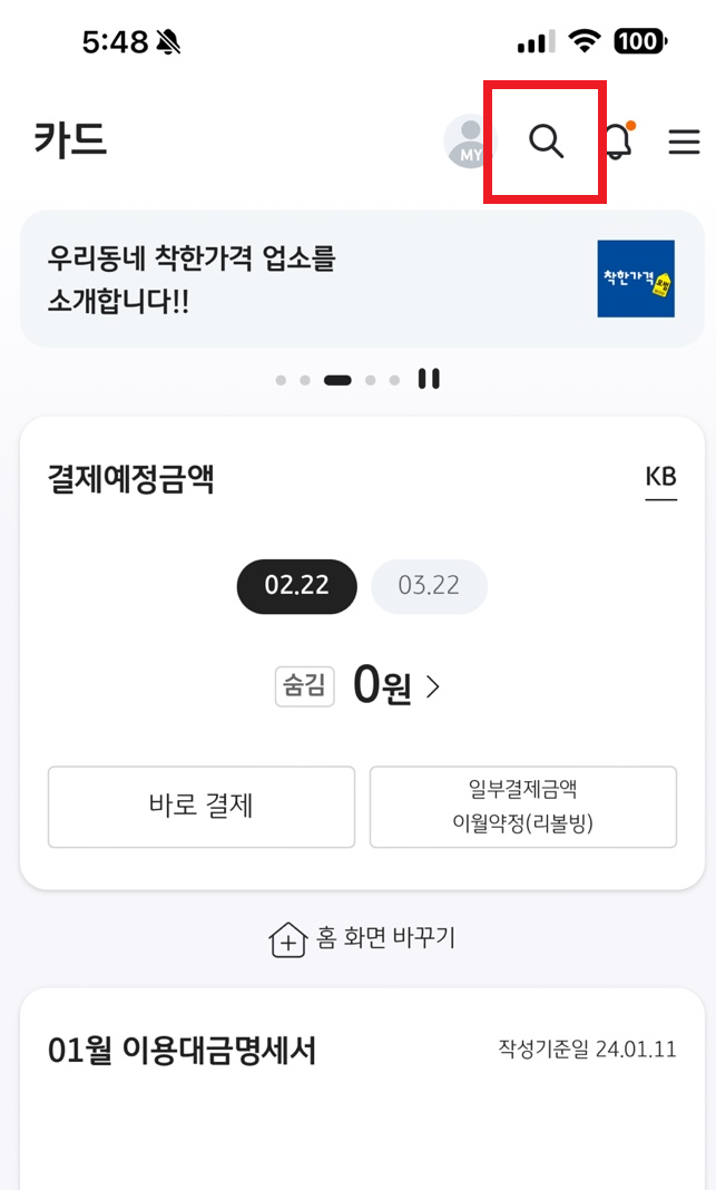 KB PAY 어플을 기준으로 설명드리겠습니다. 어플이 아닌 홈페이지에서도 직접 가능하니 위와 같은 진행으로 따라 해주세요. 우측 상단 검색표시를 눌러주세요.