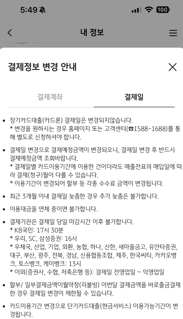 상기와 같이 변경 안내 문구가 나오게 되며 장기카드대출 결제일은 변경되지 않으며 이 부분의 변경을 원하실 경우 홈페이지 또는 고객센터로 별도 신청이 필요합니다. 당연히 대금이 연체 중일 때도 불가합니다. 꼭 한 번씩 읽어보고 넘어가주세요.