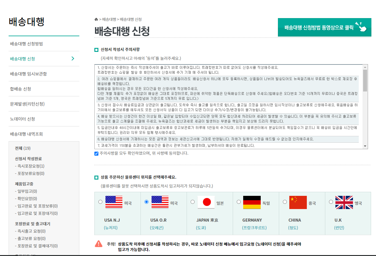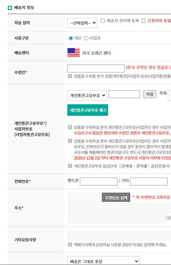 배송대행 신청으로 들어가셔서 해당하는 미국 오레곤지점을 누르시고 나의 해당하는 통관고유부호와 물건을 받아볼 주소를 작성해 주면 되겠습니다.