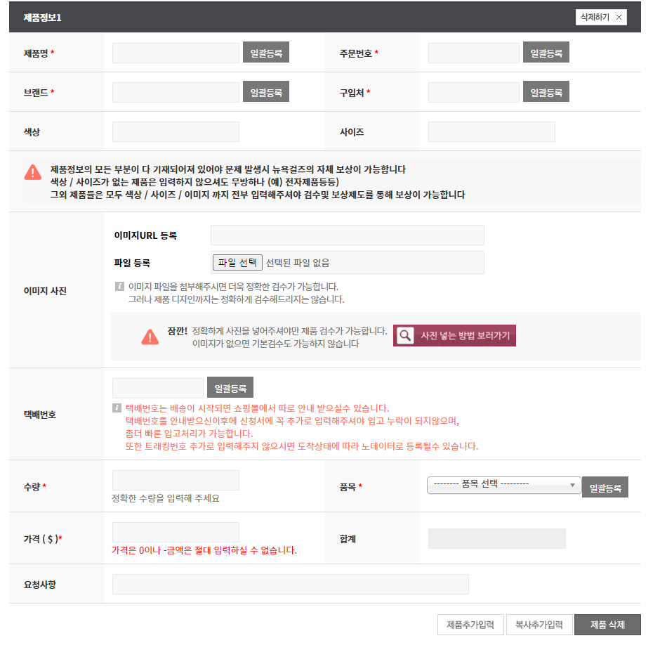 개인정보를 마무리하셨으면 아래와 같이 어떤 제품, 구매번호, 브랜드, 구입처, 수량, 품목, 가격등을 작성해 주셔야 됩니다.