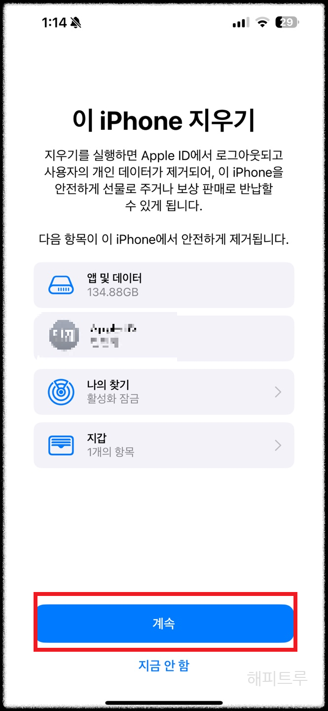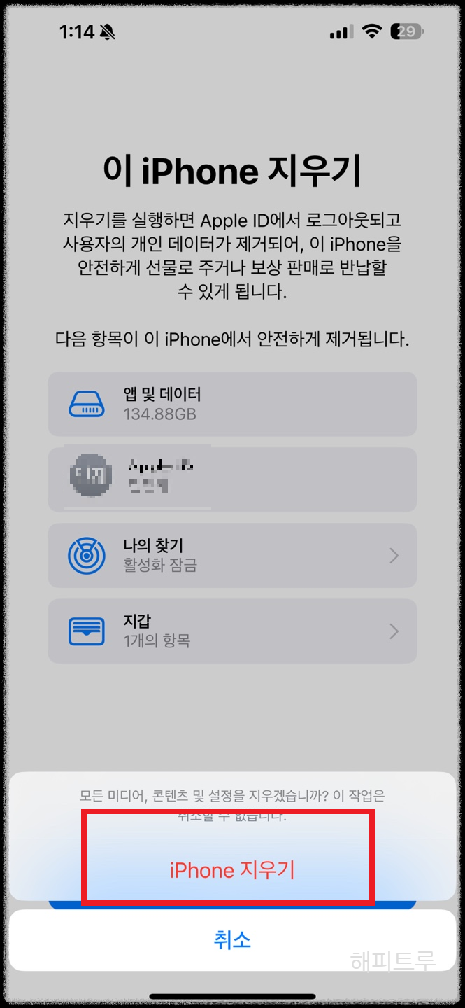 여섯째 : 정말 지우겠냐는 문구가 나오게 됩니다. 아이폰 지우기를 눌러줍니다.