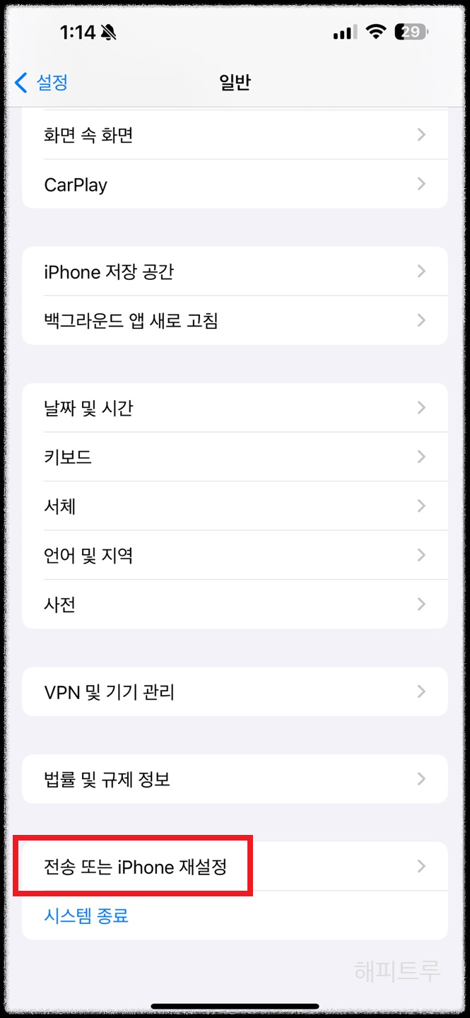 셋째 : 스크롤을 내려 전송 또는 아이폰 재설정으로 들어갑니다.