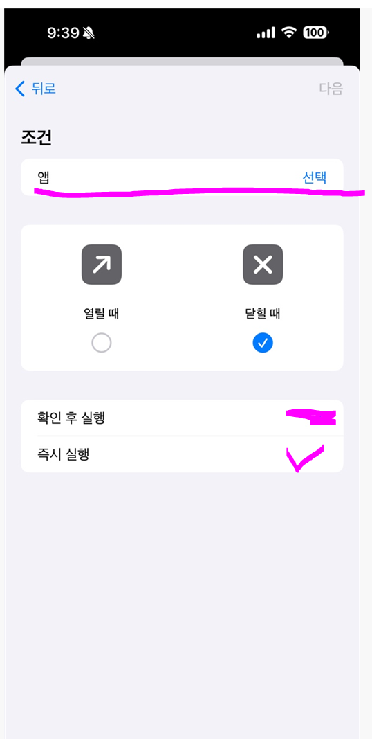4. 조건으로 들어가셔서 닫힐 때를 클릭해 주시고 즉시 실행을 체크해 주고 상단 앱검색으로 전화를 눌러줍니다.