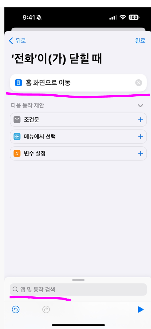 눌러주시고 앱 및 동작검색으로 가셔서 홈 화면으로 이동하기를 추가해 줍니다.