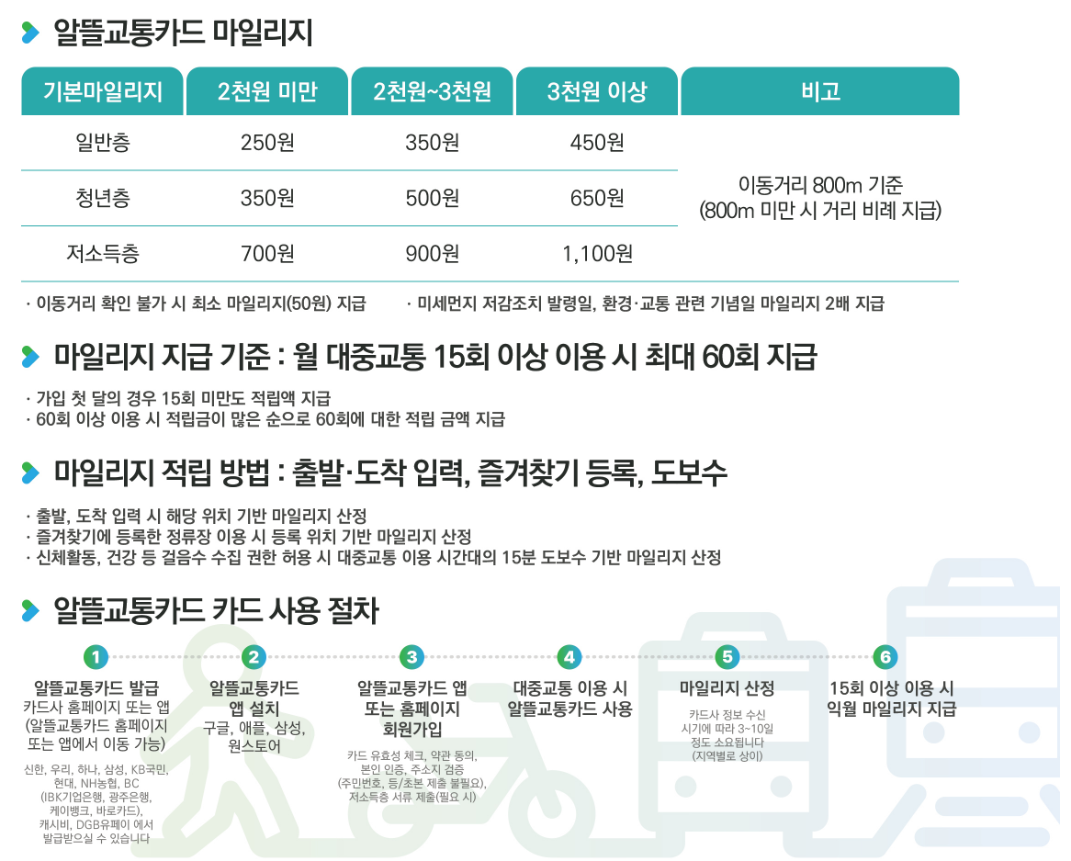 대중교통비 지출에 부담이 큰 서민의 교통비를 절감하고, 보행 및 자전거 등 친환경 교통수단을 동시에 활성화할 수 있는 새로운 수요관리 정책으로서 개인의 자발적인 노력을 통한 보상으로 대중교통 활성화를 유도하기 위한 정책입니다.