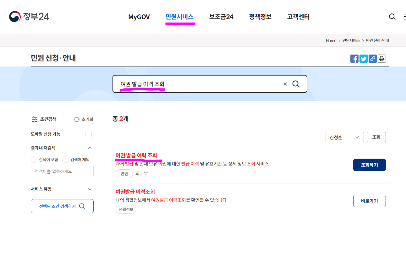 1. 정부 24 홈페이지 상단 민원서비스 -> 민원 신청, 안내 클릭 -> 검색창에 여권 발급 이력 조회 검색