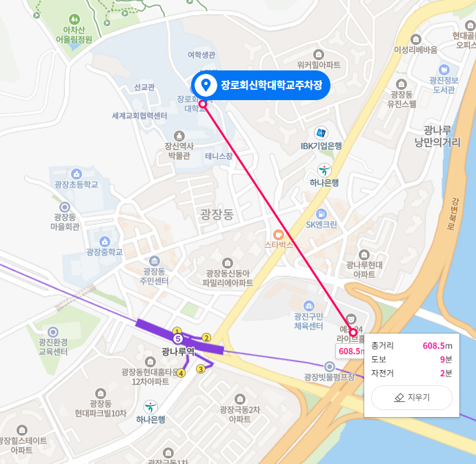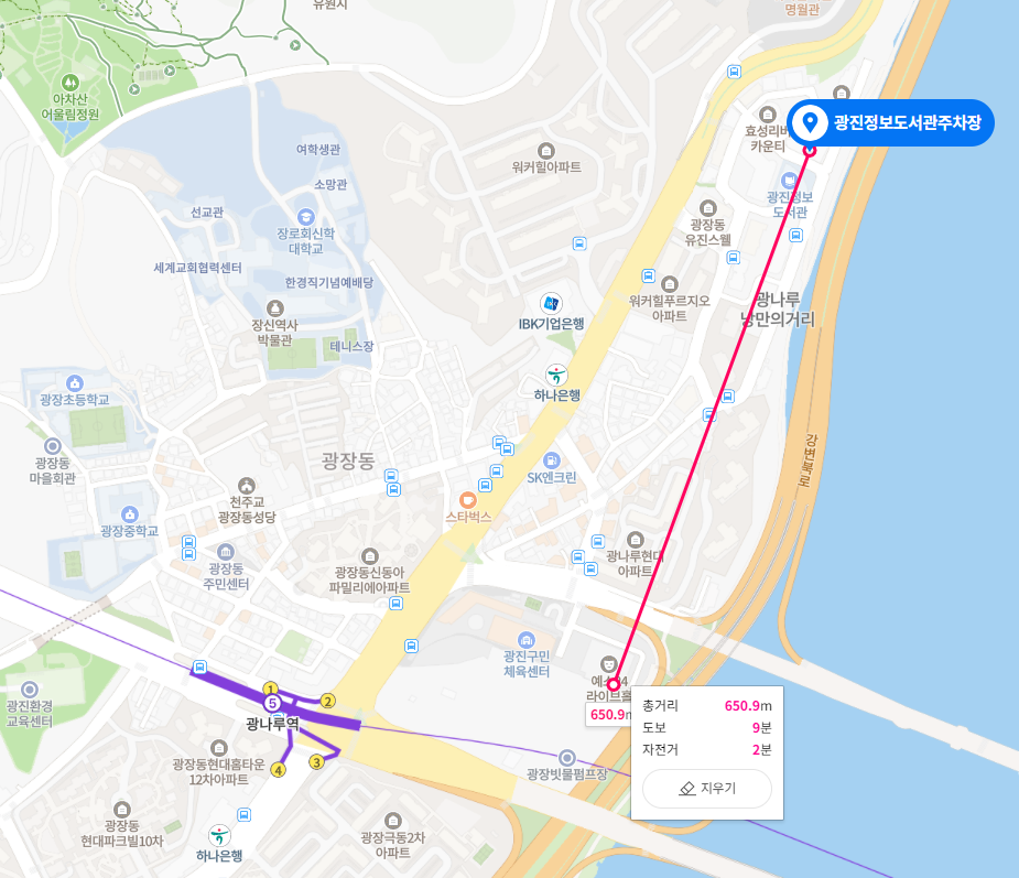 5호선 광나루역 2번 출구에서 광진교 방향으로 5분 거리에 위치