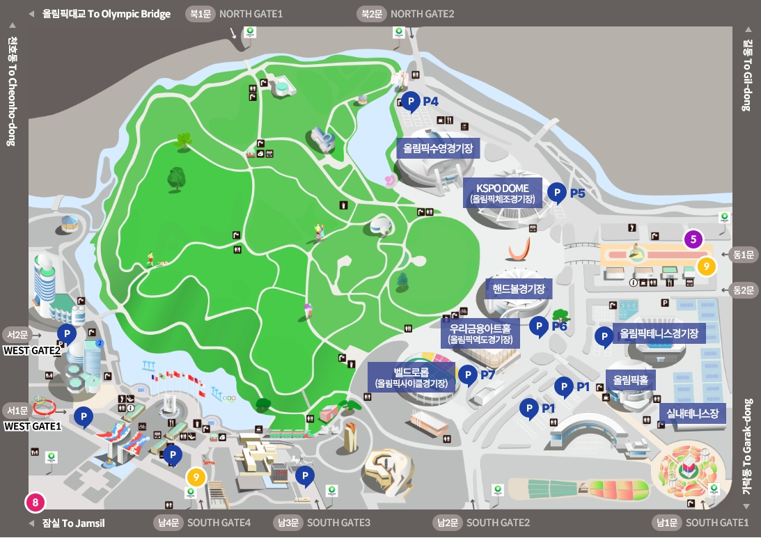 올림픽공원에 들어오시게 되면 지도와 같이 각 경기장 근처에 주차시설이 준비되어 있습니다. 각종 공연이나 경기관람을 가까이서 보시려면 근처에 주차하는 편이 가장 좋습니다. 저는 마침 올림픽체조경기장에서 콘서트가있어 근방에 주차를 했는데요. 꼭 근처에 주차를 하시지 않아도 되오니 주차장을 돌아보시고 최대한 가까운 곳에 주차하시는 것을 추천드립니다.