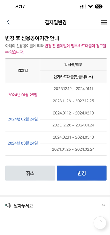 결제일 신판(일시불/할부)이용기간 단기카드대출(현금서비스)