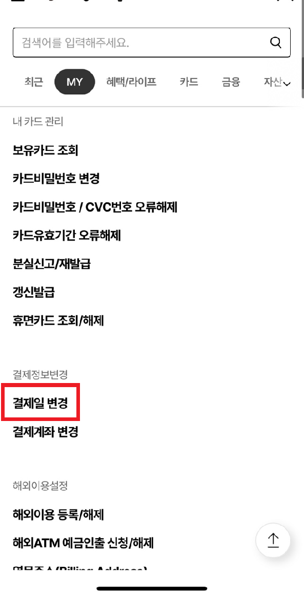 검색어를 통해 결제일 변경이라고 검색하시는 방법과 스크롤을 내려보시면 결제정보변경 및 결제일 변경 화면이 보일 겁니다.