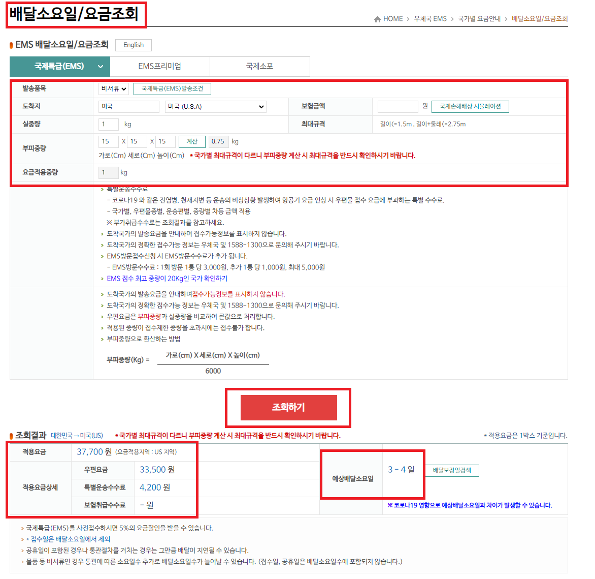 우체국 EMS 해외택배 배달소요일 및 요금조회
