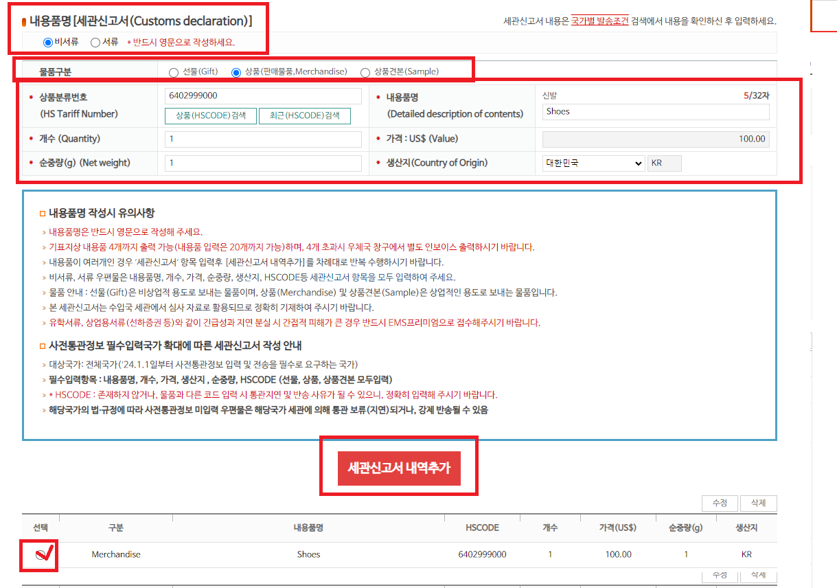보내고자 하는 상품분류번호를 검색하시고 기재하신 후에 품명, 수량, 가격, 중량, 생산지등을 눌러 [세관신고서 내역추가]를 클릭해 주시고 하단 선택 체크 해주시고 다음을 눌러주세요.