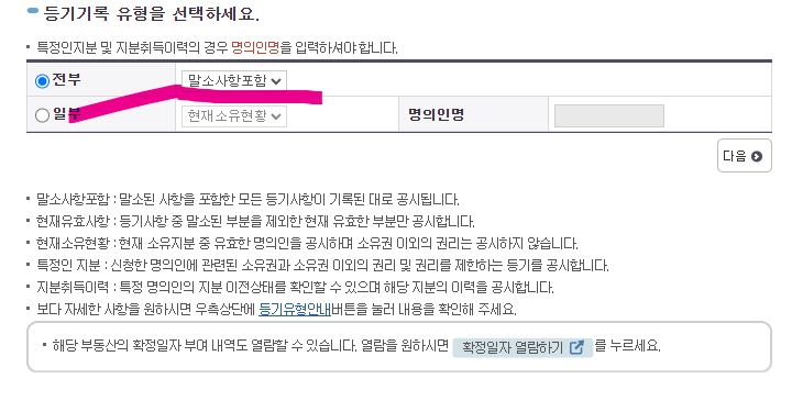 5. 해당하는곳에 선택을 누르시고 현행으로들어가 등기기록 유형을 아래와 같이 클릭합니다.