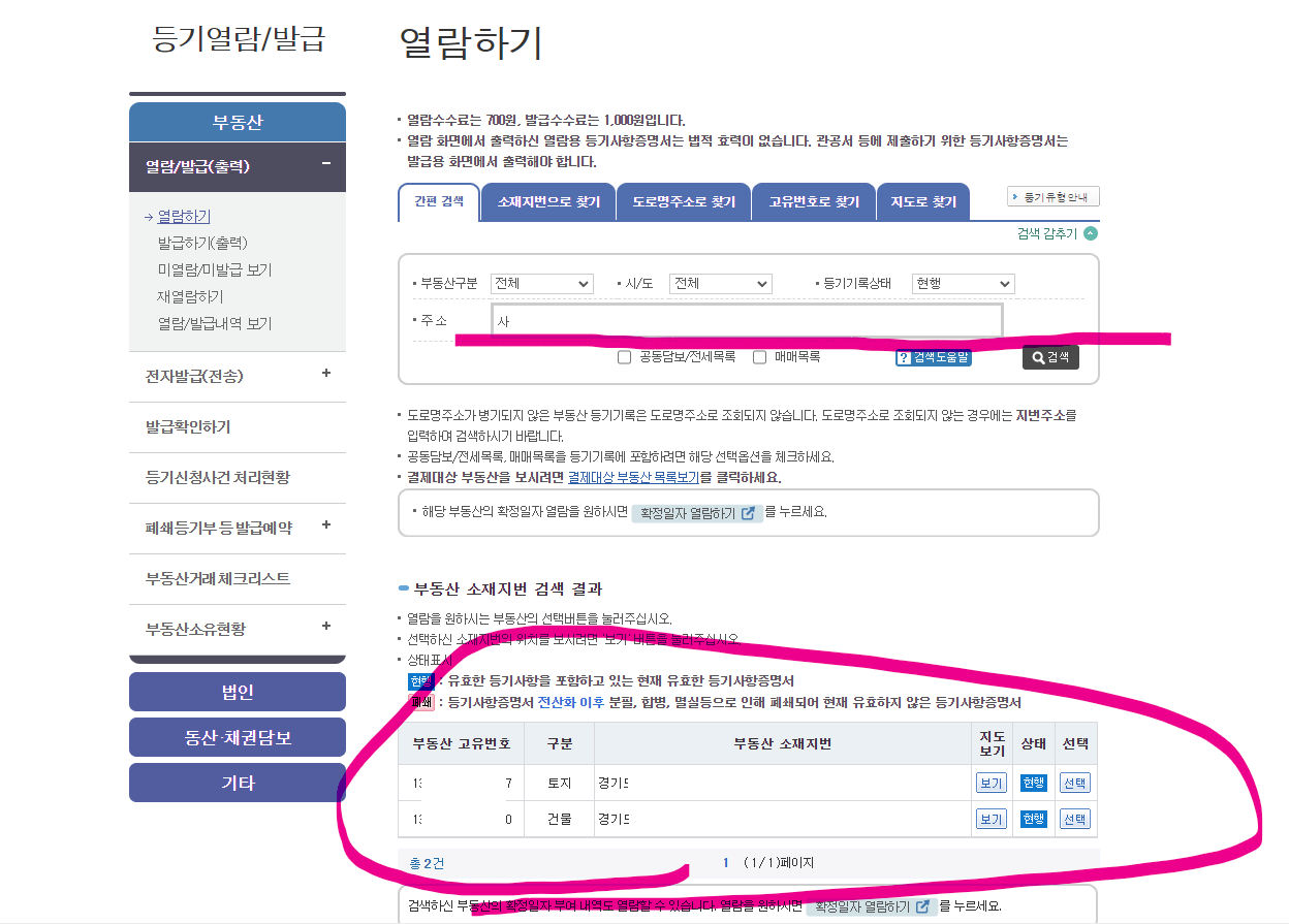 3.열람하고 싶은 주소를 검색하여 부동산 주소를 입력