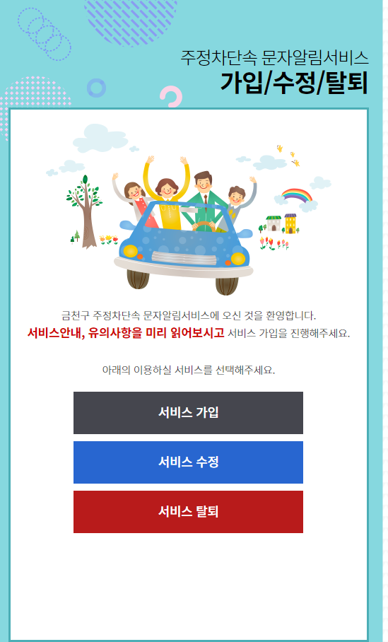 가입화면 이렇게 오늘은 주정차단속 문자 알림 서비스를 알아보았는데요. 별도로 들어가는 비용도 없고 사전에 방지하는 시스템이기에 안 할 이유가 없는 혜택인 것 같습니다. 신청하지 않으신 분들이라면 주로 이용하는 지역별로 신청해 보세요.