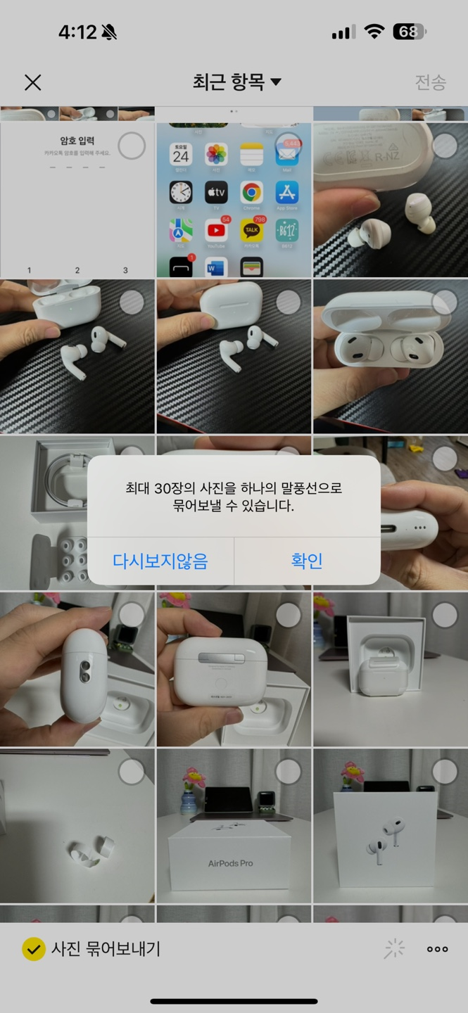 최대 30장의 사진을 하나의 말풍선으로 묶어 보낼 수 있습니다라는 문구를 확인하시고 확인을 눌러주세요.