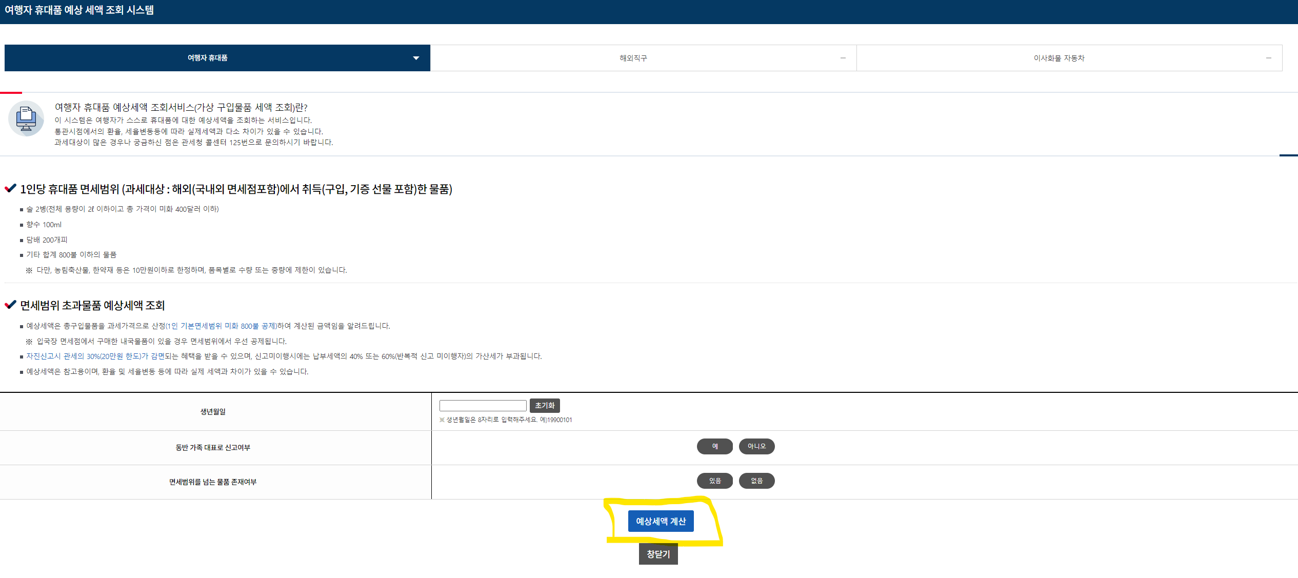 하지만 주류의 경우 별도 면세혜택을 적용받아 2병(전체 용량이 2리터 이하이고 총 가격이 미화 400달러 이하의 것으로 한정하여 면세혜택을 받을 수 있습니다. 다만, 주류 2병의 합계 용량 또는 총 가격이 면세범위를 초과한 경우라도 면세범위 내의 1병은 면세할 수 있고, 그 외 면세범위를 초과하는 구간에 있는 주류는 전체 취득가격에 대해 과세합니다.