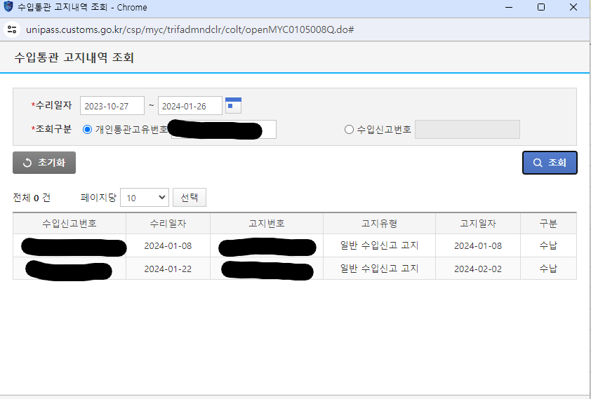 들어오시게 되면 수입신고번호 고지번호조회를 클릭해 주시면 내가 냈던 관부가세 내역들이 표기가 되는데 반품하시고자 하는 환급을 받고자 하는 내용을 클릭해주시면 되겠습니다.
