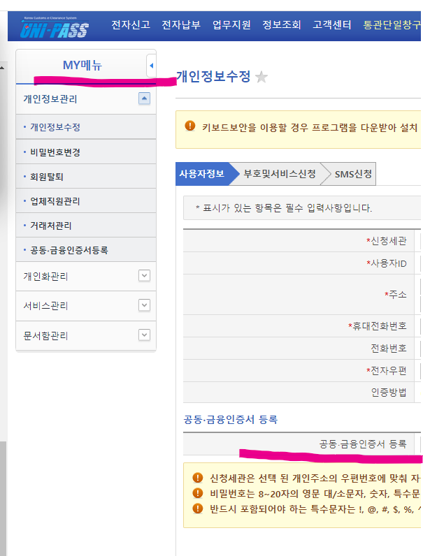 공동 및 금융인증서 등록을 하지 않으신 분들은 MY메뉴 개인정보관리 하단에서 인증서를 등록해 주세요.