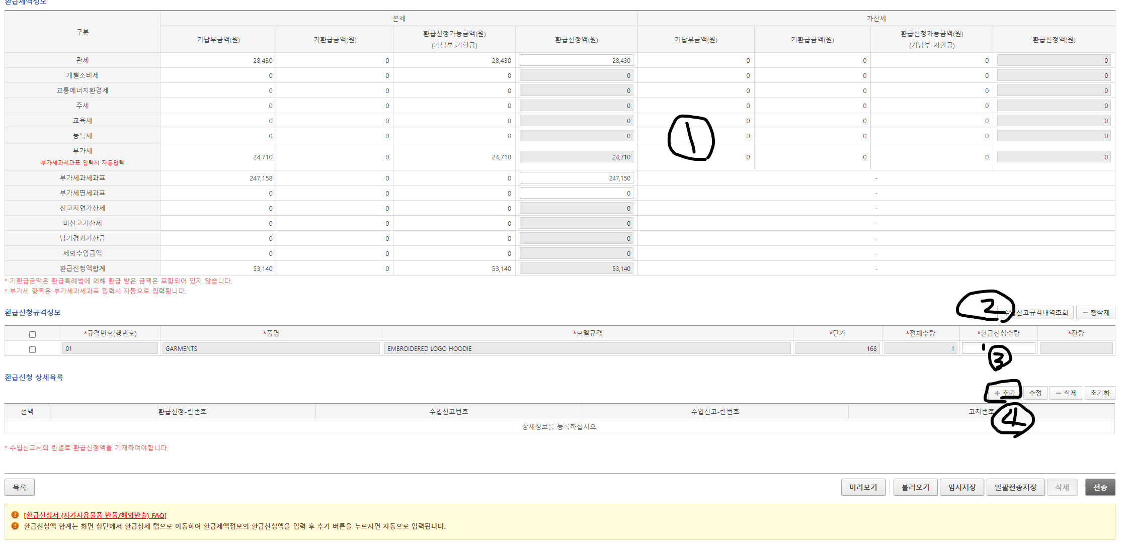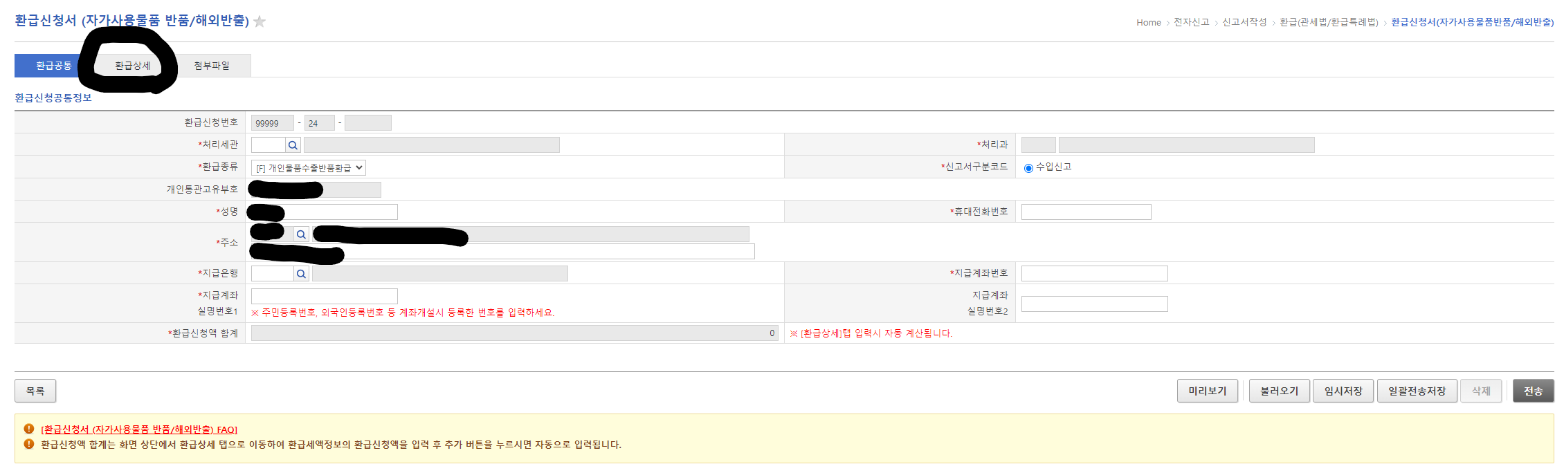 클릭하시면 환급을 받고자하는 금액을 기재하시는 공간이 있는데 왼쪽에 표기되어 있는 금액과 동일하게 입력을 해주시면 자동으로 최종합계가 계산됩니다.